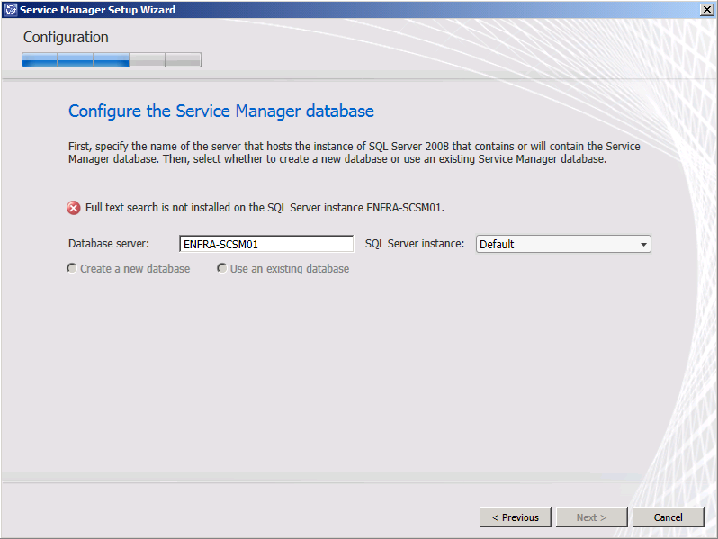 Different from other System Center products, Service Manager (SM) require the SQL Server Full-Text Search feature and also the Analysis feature.